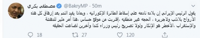 بكري: تصريحات إيران عن الطائرة الأوكرانية مثيرة للدهشة