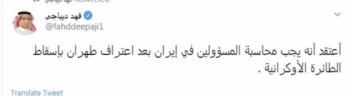 طالب المحلل السياسي السعودي فهد ديباجي، اليوم، بمحاسبة النظام الإيراني بعد الاعتراف بإسقاط الطائرة الأوكرانية بطريق الخطأ.