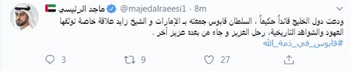 وقال في تغريدة عبر "تويتر" رصدها "المشهد العربي": "ودعت دول الخليج قائداً حكيماً ، السلطان قابوس جمعته بـ الإمارات والشيخ زايد علاقة خاصة توثقها العهود والشواهد التاريخية، رحل العزيز وجاء من بعده عزيز آخر".