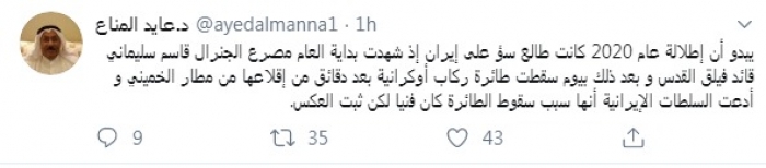 وقال في تغريدة عبر "تويتر" رصدها "المشهد العربي": "يبدو أن إطلالة عام 2020 كانت طالع سوء على إيران إذ شهدت بداية العام مصرع الجنرال قاسم سليماني قائد فيلق القدس وبعد ذلك بيوم سقطت طائرة ركاب أوكرانية بعد دقائق من إقلاعها من مطار الخميني وإدعت السلطات الإيرانية أنها سبب سقوط الطائرة كان فنيا لكن ثبت العكس".