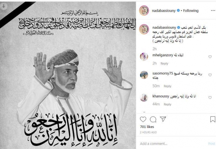 نعت الفنانة المصرية ندى بسيوني، السلطان قابوس الذي رحل عن عالمنا قبل ساعات بعد صراع مع المرض، وتقديم العزاء للشعب العماني، وذلك عبر حسابه الشخصي على موقع التواصل الاجتماعي "انستجرام".