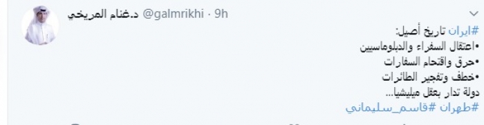 وقال في تغريدة عبر "تويتر" رصدها "المشهد العربي": "إيران تاريخ أصيل.. اعتقال السفراء والدبلوماسيين.. حرق واقتحام السفارات.. خطف وتفجير الطائرات.. دولة تدار بعقل ميليشيا".