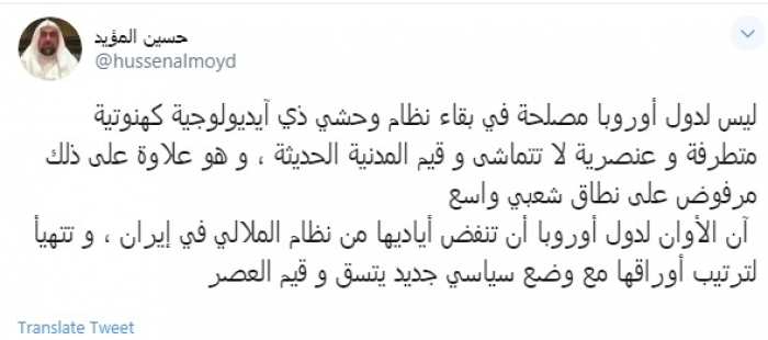 وقال في تغريدة عبر "تويتر" رصدها "المشهد العربي": "ليس لدول أوروبا مصلحة في بقاء نظام وحشي ذي آيديولوجية كهنوتية متطرفة وعنصرية لا تتماشى و قيم المدنية الحديثة ، وهو علاوة على ذلك مرفوض على نطاق شعبي واسع آن الأوان لدول أوروبا أن تنفض أياديها من نظام الملالي في إيران، وتتهيأ لترتيب أوراقها مع وضع سياسي جديد يتسق وقيم العصر".