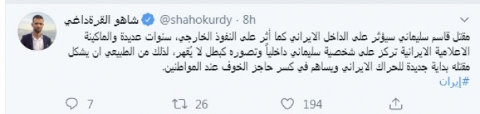 أكد الكاتب الصحفي العراقي شاهو القرةداغي، اليوم، أن مقتل قاسم سليماني سيؤثر على الداخل الإيراني.