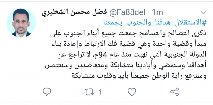 وكتب الشطيري، في تغريدة له عبر موقع التواصل الاجتماعي تويتر، تابعها المشهد العربي: "ذكرى التصالح والتسامح جمعت جميع أبناء الجنوب على مبدأ وقضية واحدة وهي قضية فك الارتباط وإعادة بناء الدولة الجنوبية التي نهبت منذ عام 94م".
