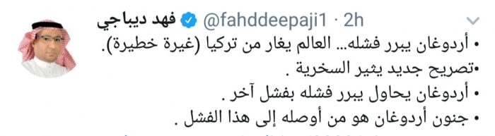 سخر المحلل السياسي السعودي فهد ديباجي، من تصريحات الرئيس التركي رجب طيب أردوغان، بأن "العالم يغار من تركيا"، بحسب مزاعمه.