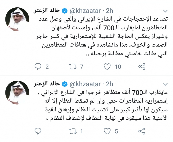 وكتب الزعتر، في تغريدة له عبر موقع التواصل الاجتماعي تويتر، تابعها المشهد العربي: "مايقارب الـ700 ألف متظاهر خرجوا في الشارع الإيراني".