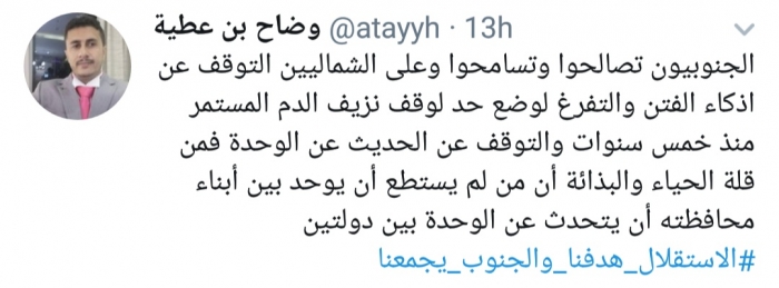 وكتب بن عطية، في تغريدة له عبر موقع التواصل الاجتماعي تويتر، تابعها المشهد العربي: "الجنوبيون تصالحوا وتسامحوا وعلى الشماليين التوقف عن إذكاء الفتن والتفرغ لوضع حد لوقف نزيف الدم المستمر منذ خمس سنوات والتوقف عن الحديث عن الوحدة".