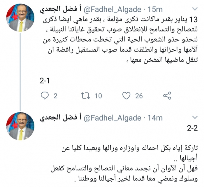 وكتب الجعدي، في تغريدة له عبر موقع التواصل الاجتماعي تويتر، تابعها المشهد العربي: "13 يناير بقدر ما كانت ذكرى مؤلمة، بقدر ماهي أبضا ذكرى للتصالح والتسامح للانطلاق صوب تحقيق غاياتنا النبيلة، لنحذو حذو الشعوب الحية التي تخطت محطات كثيرة من آلامها وأحزانها وانطلقت قدما صوب المستقبل رافضة ان تنقل ماضيها المثخن معها، تاركة إياه بكل أحماله وأوزاره ورائها وبعيدا كليا عن أجيالها".