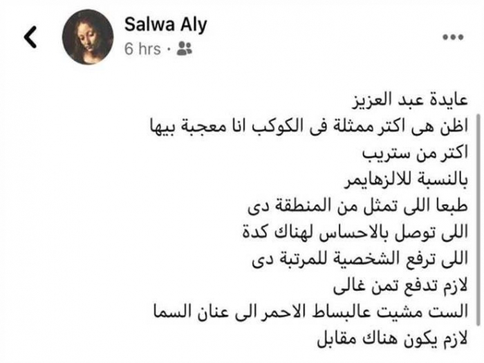 وكتبت، عبر حسابها الشخصي على فيسبوك: "عايدة عبد العزيز، أظن هي أكتر ممثلة في الكوكب أنا معجبة بيها، أكتر من ستريب، بالنسبة للألزهايمر، طبعا اللي تمثل من المنطقة دي، اللي توصل بالإحساس لهناك كده، اللي ترفع الشخصية للمرتبة دي لازم تدفع تمن غالي، الست مشيت على البساط الأحمر إلى عنان السما، لازم يكون هناك مقابل".