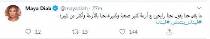 وكتبت مايا، عبر حسابها على"تويتر"،: "ما بقى حدا يقول نحن رايحين ع أزمة كتير صعبة وكبيرة.. نحن بالأزمة وأكتر من كبيرة".