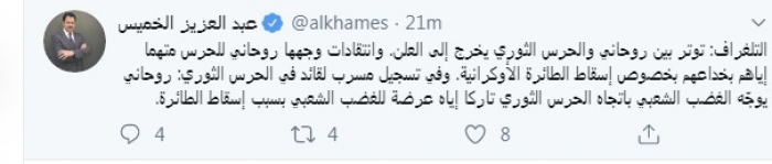 وقال في تغريدة عبر "تويتر" رصدها "المشهد العربي": "التلغراف.. توتر بين روحاني والحرس الثوري يخرج إلى العلن. وانتقادات وجهها روحاني للحرس متهما إياهم بخداعهم بخصوص إسقاط الطائرة الأوكرانية. وفي تسجيل مسرب لقائد في الحرس الثوري: روحاني يوجّه الغضب الشعبي باتجاه الحرس الثوري تاركا إياه عرضة للغضب الشعبي بسبب إسقاط الطائرة".