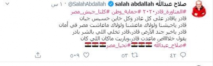 نشر الفنان المصري القدير صلاح عبدالله، عبر حسابه الشخصي بموقع "تويتر" تغريدة يعلق بها على مناورة قادر 2020 التي يخوضها الجيش المصري.