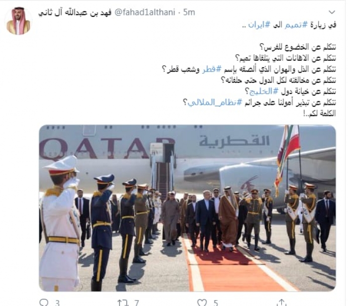 وقال في تغريدة عبر "تويتر" رصدها "المشهد العربي": "في زيارة تميم إلى إيران.. نتكلم عن الخضوع للفرس؟.. نتكلم عن الإهانات التي يتلقاها تميم؟.. نتكلم عن الذل والهوان الذي ألصقه باسم قطر وشعب قطر؟".