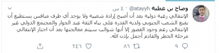 وكتب بن عطية عبر "تويتر ":"الانتقالي رغبة دولية بعد أن أصبح إرادة شعبية ولا يوجد أي طرف منافس يستطيع أن يقنع الشعب الجنوبي ولديه القدرة على بناء الثقة عند الجوار والمجتمع الدولي غير الانتقالي".