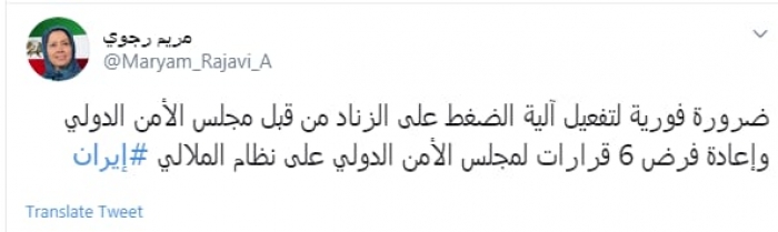 وقالت في تغريدة عبر "تويتر" رصدها "المشهد العربي": "ضرورة فورية لتفعيل آلية الضغط على الزناد من قبل مجلس الأمن الدولي وإعادة فرض 6 قرارات لمجلس الأمن الدولي على نظام الملالي إيران".