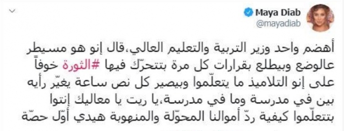 نشرت الفنانة اللبنانية مايا دياب، عبر حسابها الشخصي بموقع "تويتر" تغريدة توجه بها رسالة لوزير التعليم العالي اللبناني.