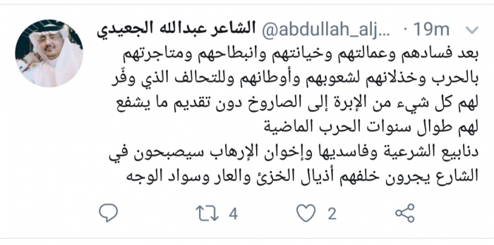 وكتب الجعيدي، في تغريدة له على موقع التواصل الاجتماعي تويتر، تابعها المشهد العربي: "بعد فسادهم وعمالتهم وخيانتهم وانبطاحهم ومتاجرتهم بالحرب وخذلانهم لشعوبهم وأوطانهم وللتحالف الذي وفّر لهم كل شيء من الإبرة إلى الصاروخ دون تقديم ما يشفع لهم طوال سنوات الحرب الماضية".