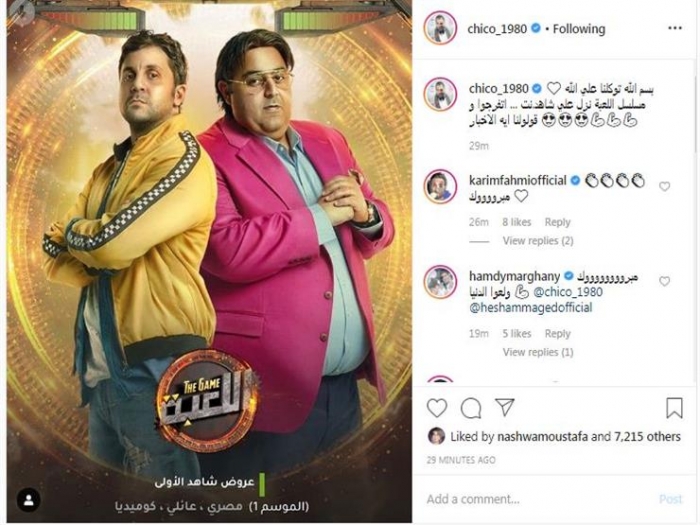 ونشر شيكو، بوسترًا للمسلسل يجمعه مع هشام ماجد عبر حسابه على"إنستجرام"، وعلق: "بسم الله توكلنا على الله.. مسلسل اللعبة نزل على شاهد.نت.. اتفرجوا وقولولنا إيه الأخبار".