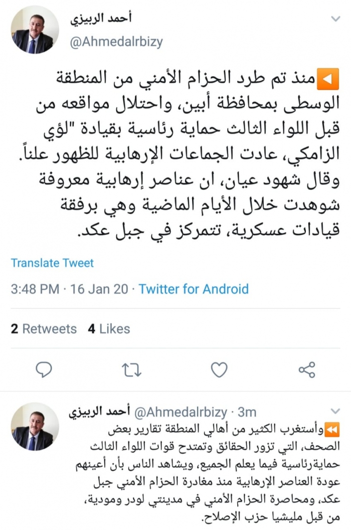 وكتب الربيزي، في تغريدة له عبر موقع التواصل الاجتماعي تويتر، تابعها المشهد العربي: "منذ تم طرد الحزام الأمني من المنطقة الوسطى بمحافظة أبين، واحتلال مواقعه من قبل اللواء الثالث حماية رئاسية بقيادة لؤي الزامكي، عادت الجماعات الإرهابية للظهور علناً".