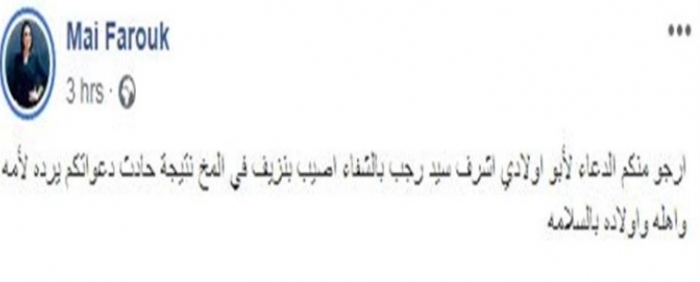 كتبت فاروق، عبر حسابها على "فيسبوك": "أرجو منكم الدعاء لأبو أولادي أشرف سيد رجب بالشفاء، لقد أصيب بنزيف في المخ نتيجة حادث، دعواتكم يرده لأمه وأهله وأولاده بالسلامة".