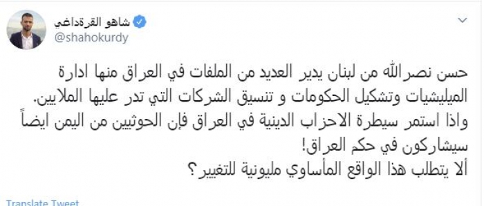 أكد الكاتب الصحفي العراقي شاهو القرةداغي، اليوم، أن الأمين العام لحزب الله حسن نصرالله يتحكم في العديد من الملفات في العراق.