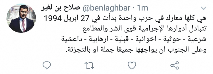 وكتب بن لغبر، في تغريدة له عبر موقع التواصل الاجتماعي تويتر، تابعها المشهد العربي: "هي كلها معارك في حرب واحدة بدأت في 27 ابريل 1994