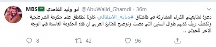 دشن الناشط السياسي السعودي أبو وليد الغامدي، اليوم، هاشتاج "دبابة الانتقالي" لكشف زيف حكومة الشرعية.