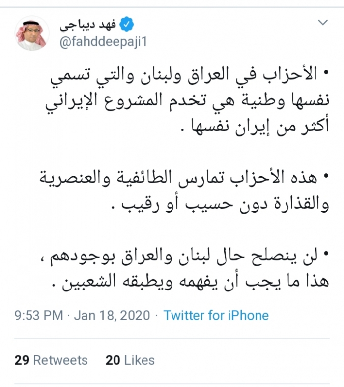 هاجم المحلل السياسي السعودي فهد ديباجي، الأحزاب في العراق ولبنان.