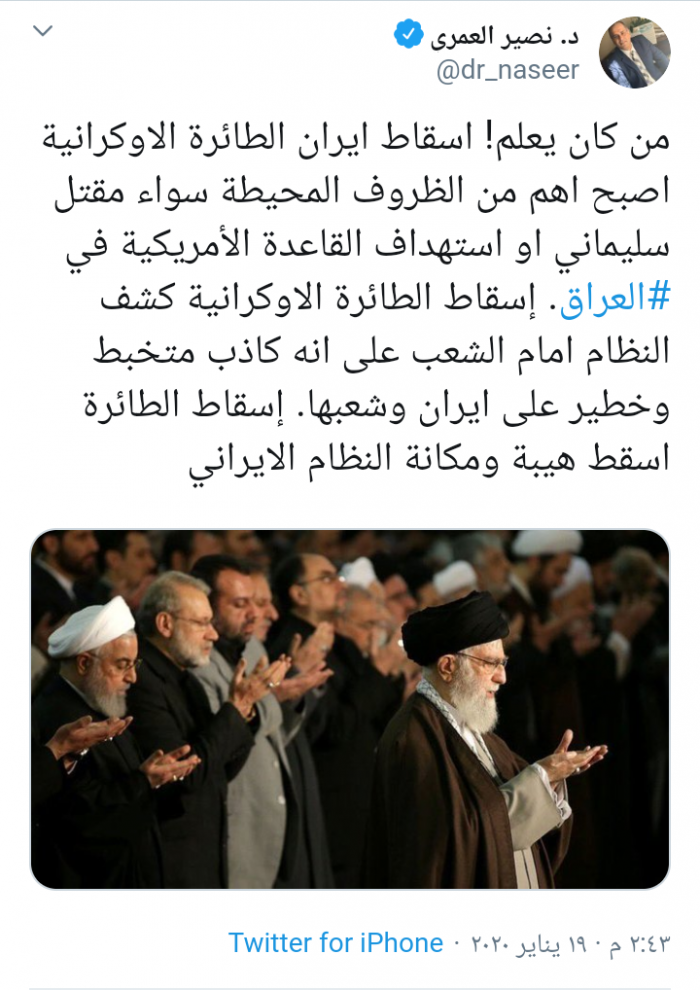 وكتب العمري، في تغريدة له عبر موقع التواصل الاجتماعي تويتر، تابعها المشهد العربي: "من كان يعلم! إسقاط إيران الطائرة الأوكرانية أصبح أهم من الظروف المحيطة سواء مقتل سليماني أو استهداف القاعدة الأمريكية في العراق".