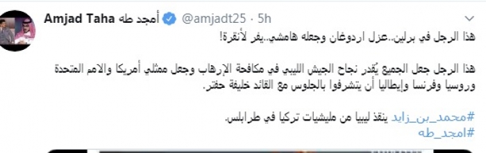 وقال في تغريدة عبر "تويتر" رصدها "المشهد العربي": "هذا الرجل في برلين..عزل أردوغان وجعله هامشي..يفر لأنقرة! هذا الرجل جعل الجميع يُقدر نجاح الجيش الليبي في مكافحة الإرهاب وجعل ممثلي أمريكا والامم المتحدة وروسيا وفرنسا وإيطاليا أن يتشرفوا بالجلوس مع القائد خليفة حفتر. محمد بن زايد ينقذ ليبيا من مليشيات تركيا في طرابلس".