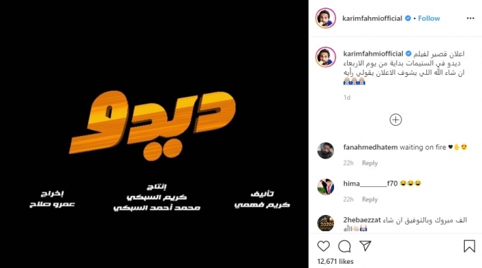 كشف الفنان كريم فهمي عن موعد طرح إعلان تشويقي لفيلمه الجديد "ديدو" بالسينمات.