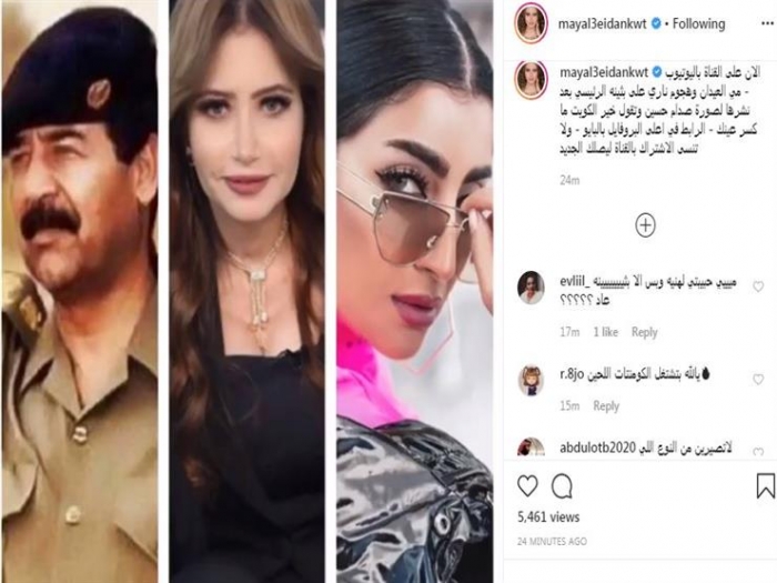 وقالت العيدان لبثينة الرئيسي في الفيديو: "تنشرين صورة لصدام حسين، معقول خير الكويت ما كسر عينك".