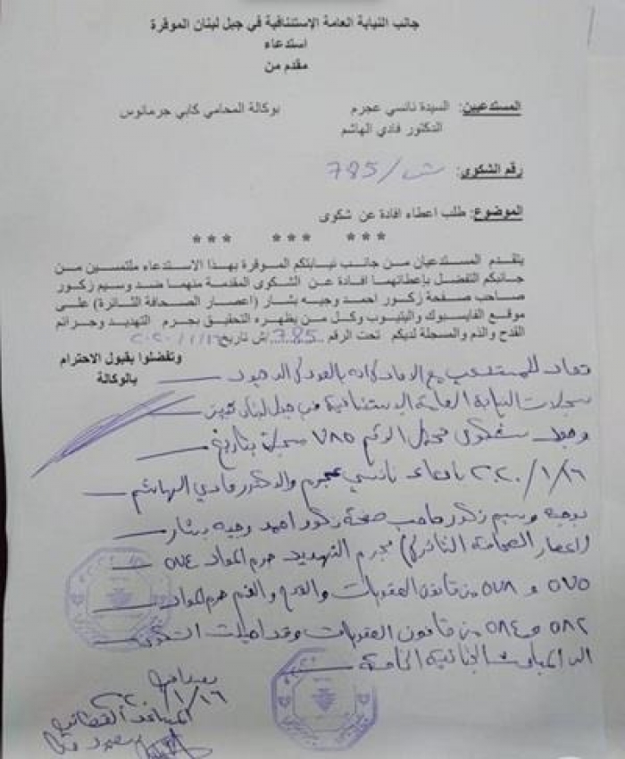 ووفقا لموقع قناة الجديد اللبنانية، جاءت الدعوى بجرم التهديد المنصوص عليه في المواد 574 و 575 و 578 عقوبات وجرائم القدح والذم المنصوص عليها في المادتين 582 و 584 عقوبات.