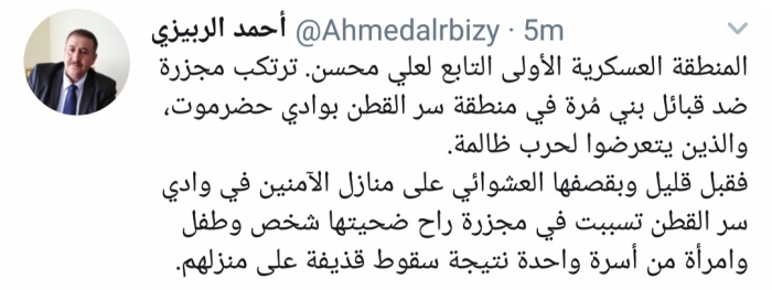 وكتب الربيزي، في تغريدة له عبر موقع التواصل الاجتماعي تويتر، تابعها المشهد العربي: "المنطقة العسكرية الأولى التابعة لعلي محسن ترتكب مجزرة ضد قبائل بني مُرة في منطقة سر القطن بوادي حضرموت، والذين يتعرضوا لحرب ظالمة".