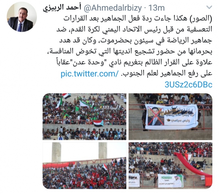 نشر الناشط السياسي أحمد الربيزي، صورا لردود أفعال جماهير الجنوب العربي، بعد القرارات التعسفية الأخيرة من قبل رئيس الاتحاد اليمني لكرة القدم.