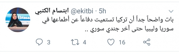 وكتبت الكتبي، في تغريدة لها عبر موقع التواصل الاجتماعي تويتر، تابعها المشهد العربي: "بات واضحاً جداً أن تركيا تستميت دفاعاً عن أطماعها في سوريا وليبيا حتى آخر جندي سوري".