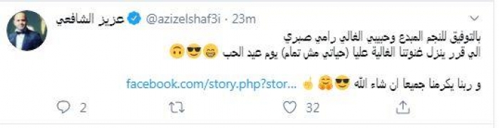 وكتب الشافعي، عبر حسابه في "تويتر"، قائلاً: "بالتوفيق للنجم المبدع وحبيبي الغالي رامي صبري اللي قرر ينزل غنوتنا الغالية عليا (حياتي مش تمام) يوم عيد الحب.. وربنا يكرمنا جميعًا إن شاء الله".