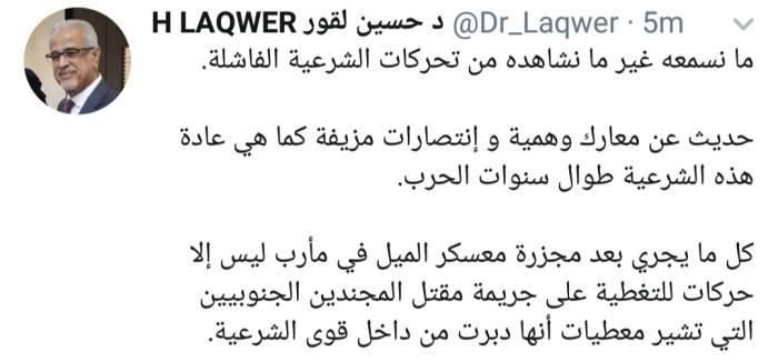 وكتب لقور، في تغريدة له على موقع التواصل الاجتماعي تويتر، تابعها المشهد العربي: "ما نسمعه غير ما نشاهده من تحركات الشرعية الفاشلة".