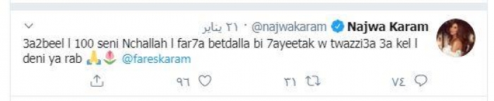 وعلقت: "عقبال الـ 100 سنة إن شا لله، والفرحة تضل بحياتك وتوزعها على كل الدني يارب يا فارس".