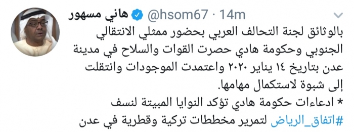 وكتب مسهور، في تغريدة له على موقع التواصل الاجتماعي تويتر، تابعها المشهد العربي: "بالوثائق لجنة التحالف العربي بحضور ممثلي الانتقالي الجنوبي وحكومة هادي حصرت القوات والسلاح في مدينة عدن بتاريخ ١٤ يناير ٢٠٢٠ واعتمدت الموجودات وانتقلت إلى شبوة لاستكمال مهامها".