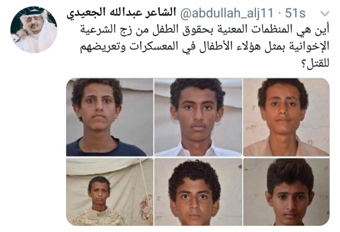 وتساءل الجعيدي، في تغريدة له على موقع التواصل الاجتماعي تويتر، تابعها المشهد العربي: "أين هي المنظمات المعنية بحقوق الطفل من زج الشرعية الإخوانية بمثل هؤلاء الأطفال في المعسكرات وتعريضهم للقتل؟".