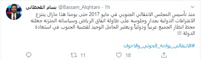 وكان مغردون دشنوا هاشتاج "الانتقالي يواجه الحوثي والإخوان"، مؤكدين أن المجلس الانتقالي الجنوبي، يُواجه بشكل منفرد أجندات تركيا وقطر وإيران، متهمين حكومة الشرعية الخاضعة لحزب الإصلاح الإخواني بالانصراف عن مكافحة الإرهاب الحوثي إلى الاعتداء على شعب الجنوب.