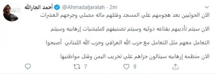 وقال في تغريدة عبر "تويتر" رصدها "المشهد العربي": "الآن الحوثيين بعد هجومهم على المسجد وقتلهم مائة مصلي وجرحهم العشرات الآن سيتم تأديبهم بقناعة دولية وسيتم تصنيفهم كمليشيات إرهابية وسيتم التعامل معهم مثل التعامل مع حزب الله العراقي وحزب الله اللبناني أصبحوا الآن منظمة إرهابية سينالون جزائهم علي تخريب اليمن وقتل مواطنيها".