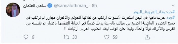 أكد الإعلامي السعودي سامي العثمان، اليوم، أن من يُطالب بالوحدة يدخل ضمنًا في مرتبة الخيانة العظمى، مشيرًا إلى أن حان الوقت ليفك الجنوب العربي ارتباطه.
