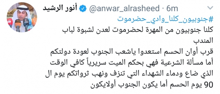 وكتب الرشيد، في تغريدة له عبر موقع التواصل الاجتماعي تويتر، تابعها المشهد العربي: "كلنا جنوبيون من المهرة لحضرموت لعدن لشبوة لباب المندب.. قرب أوان الحسم استعدوا يا شعب الجنوب لعودة دولتكم".
