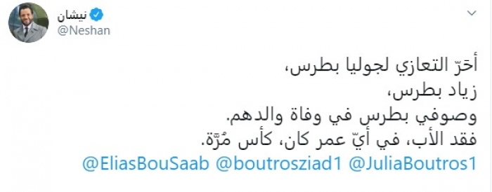 ونعى الإعلامى اللبنانى الشهير نيشان والد جوليا بطرس عبر حسابه بموقع "تويتر"، حيث كتب "أحَرّ التعازى لجوليا بطرس، زياد بطرس، وصوفى بطرس فى وفاة والدهم. فقد الأب فى أى عمر كان كأس مُرَّة".