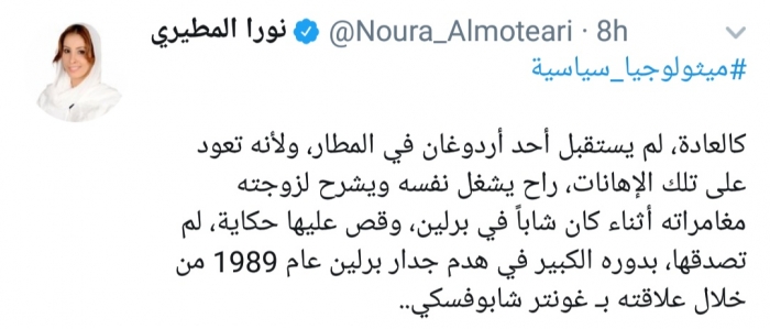 وكتبت المطيري، في تغريدة له عبر موقع التواصل الاجتماعي تويتر، تابعها المشهد العربي: "كالعادة، لم يستقبل أحد أردوغان في المطار، ولأنه تعود على تلك الإهانات، راح يشغل نفسه ويشرح لزوجته مغامراته أثناء كان شاباً في برلين، وقص عليها حكاية، لم تصدقها، بدوره الكبير في هدم جدار برلين عام 1989 من خلال علاقته بـ غونتر شابوفسكي".
