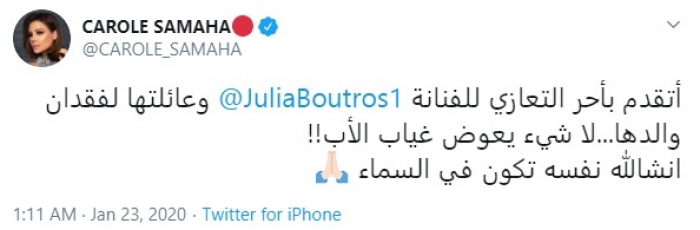 وكتبت سماحة لبطرس عبر حسابها بموقع تويتر: "أتقدم بأحر التعازي للفنانة جوليا بطرس وعائلتها لفقدان والدها...لا شيء يعوض غياب الأب!! انشالله نفسه تكون في السماء".