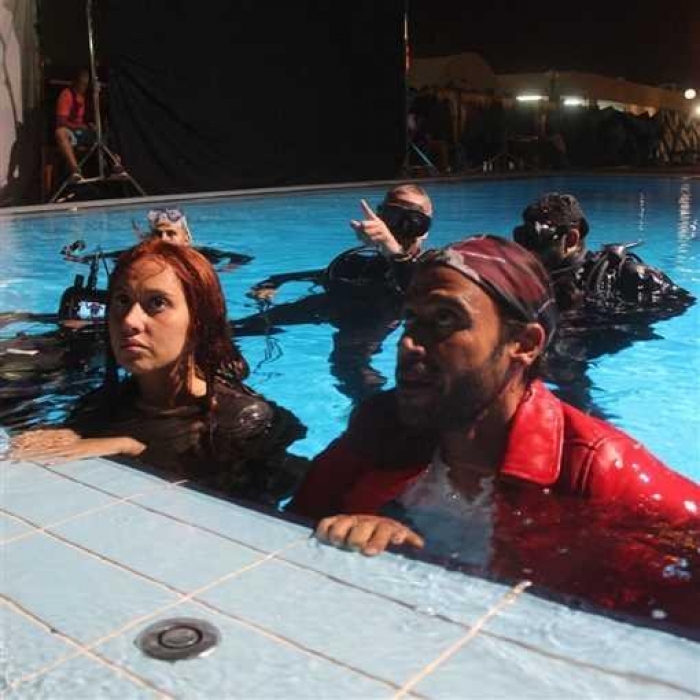 وظهرت ياسمين رئيس في حمام السباحة برفقة محمد إمام وفريق مختص لتنفيذ المشهد.